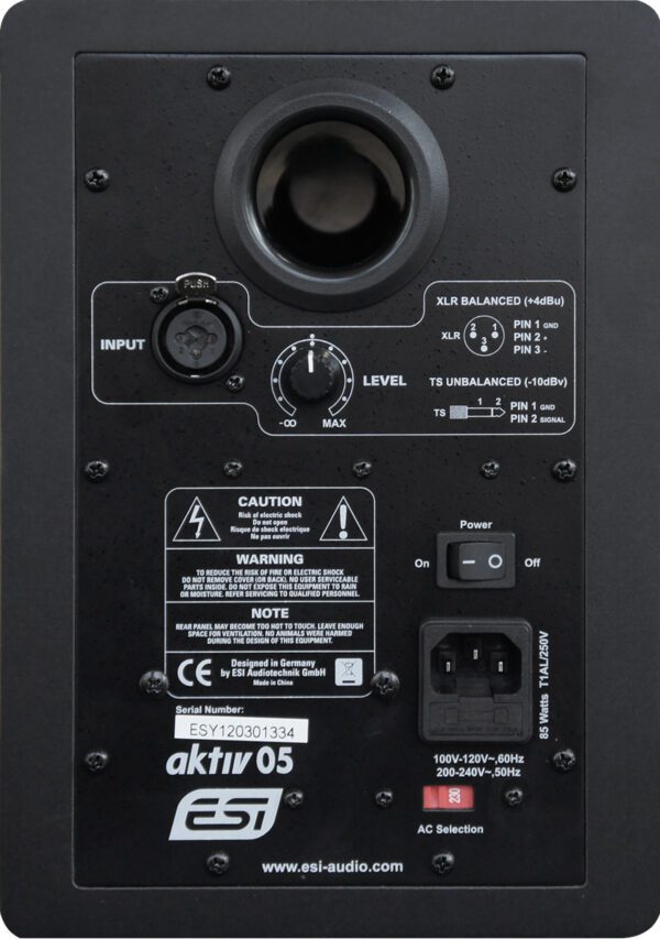 The built-in amplifier channels a commanding 30W to the tweeter and an equally potent 30W to the woofer, ensuring pristine audio reproduction. Furthermore, the universal power supply includes a user-friendly switch for effortless toggling between 115V and 230V operation, rendering the Aktiv 05 suitable for use anywhere across the globe.
