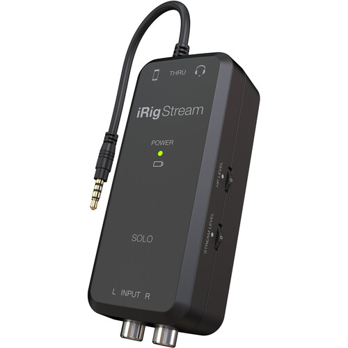The iRig Stream Solo is equipped with a stereo RCA input that enables you to connect a feed from a DJ mixer, mixing console, keyboard, or drum machine. Additionally, its 3.5mm TRRS port allows you to talk over the stereo input when you connect a headset, headphones with a built-in mic, or other IK Multimedia devices, such as the iRig Mic Lav, iRig Mic, or iRig Pre 2 (all available separately).