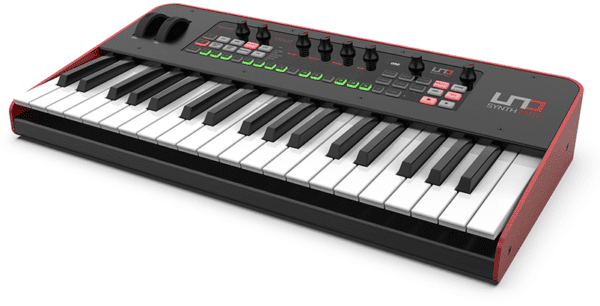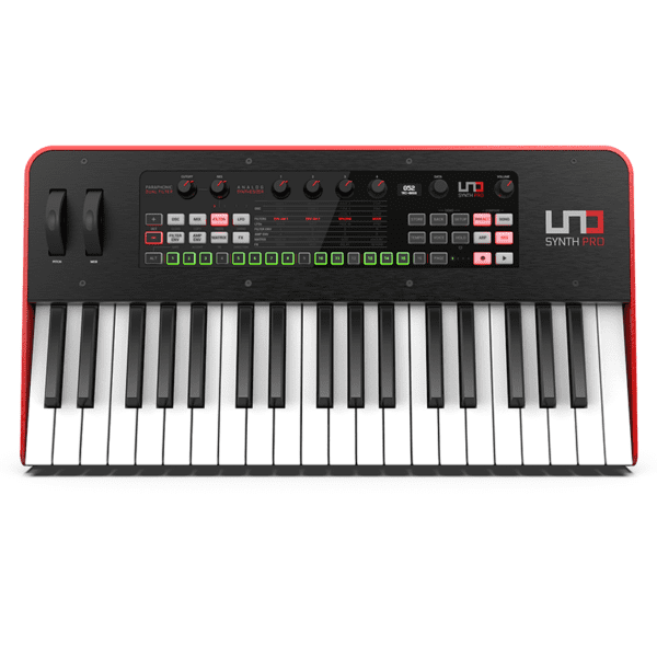 The full-sizedĀ UNO Synth ProĀ weighs in at 5.8 kg having a mainly-metal chassis, striking aesthetics and a high-quality, 37 note Fatar keybed (type TPS9) with Aftertouch sensitivity.
